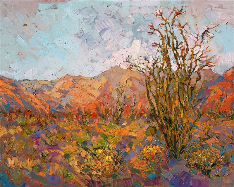 Note on varnishing: Erin’s paintings take six to eight weeks to dry, at which time we apply a retouching varnish, which allows the painting to complete the curing process while having a layer of protection against dirt and scuffs. The full curing process for an impasto oil painting takes at least two years. We are happy to assist in applying a final finishing varnish to your Erin Hanson oil painting once it has been dry for at least two years. Here is more information on how to care for your original oil painting.