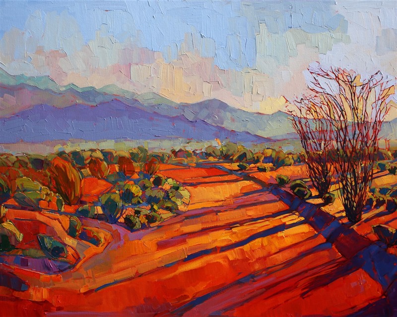 Desert color, seen through the eyes of the artist, is brilliant and full of interesting textures and contrasts. The late afternoon is one of Hanson's favorite times of the day for hiking and getting inspiration for paintings, as in this painting of Borrego Springs, California.