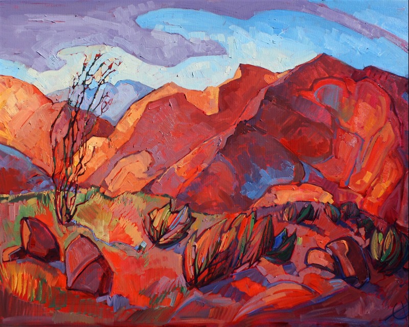 Bright colors capture the feeling of a Borrego Springs summer. The spidery ocotillo cactus cuts a mosaic of color out of the landscape, and fiery desert shrubs fill the foreground.