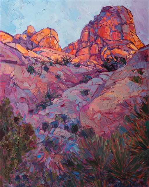 Joshua Tree National Park is most beautiful at dawn, the boulders glowing with myriad rainbow hues. The shadows are rich with reflected color, a beautiful contrast to the sun-lit rocks in the distance. The brush strokes in this oil painting are thick and impressionistic.