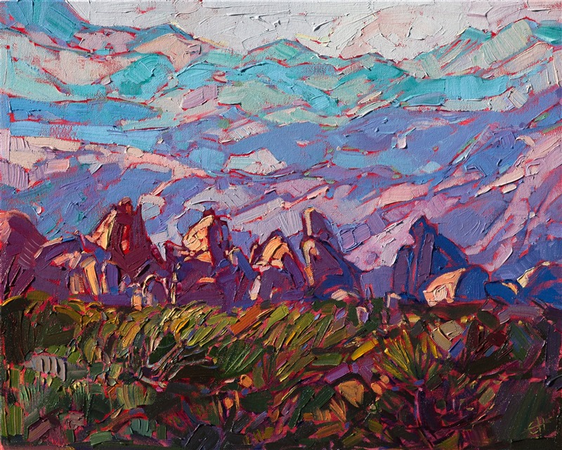 Small boulders frolic in the foothills of the desert mountain ranges of Joshua Tree National Park. The loose, playful brush strokes are alive with motion and light. This small oil painting has been framed and arrives ready to hang.