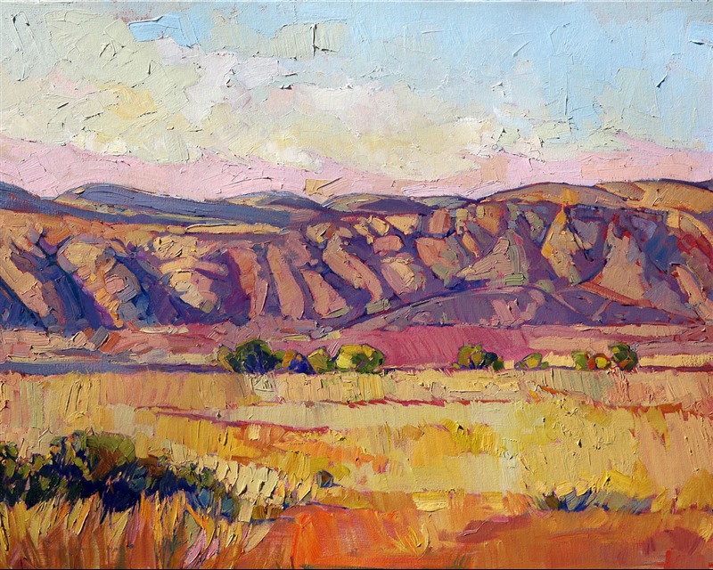 Style: "Open Impressionism" is a new style of painting developed by American artist Erin Hanson. The style is characterized by short, impasto brush strokes that are applied without layering, creating a mosaic or stained-glass appearance to the paintings. The paintings are created with a limited palette of colors, applied without blending or mixing upon the canvas, which adds a dimension of texture to each brush stroke. Inspired by classic impressionism, pointillism, and post-impressionism, Erin Hanson continues the tradition of impressionism into the modern day with her colorful and vivacious landscape paintings.