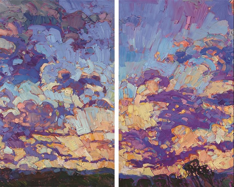 Note on varnishing: Erin’s paintings take six to eight weeks to dry, at which time we apply a retouching varnish, which allows the painting to complete the curing process while having a layer of protection against dirt and scuffs. The full curing process for an impasto oil painting takes at least two years. We are happy to assist in applying a final finishing varnish to your Erin Hanson oil painting once it has been dry for at least two years. Here is more information on how to care for your original oil painting.