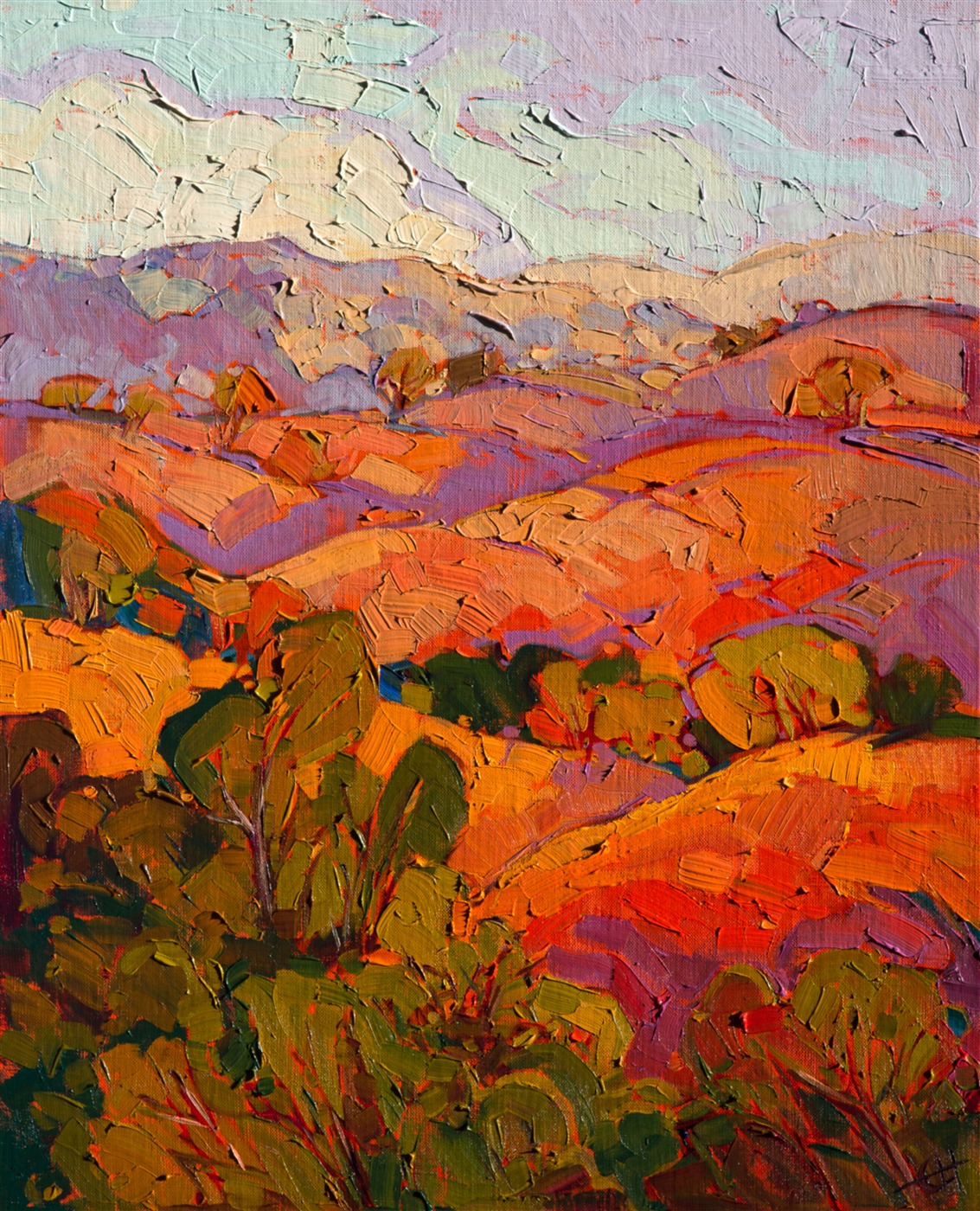 Cadmium light saturates these Paso Robles hills in dramatic late afternoon color. The brush strokes, thickly applied, create a mosaic of color and texture.
