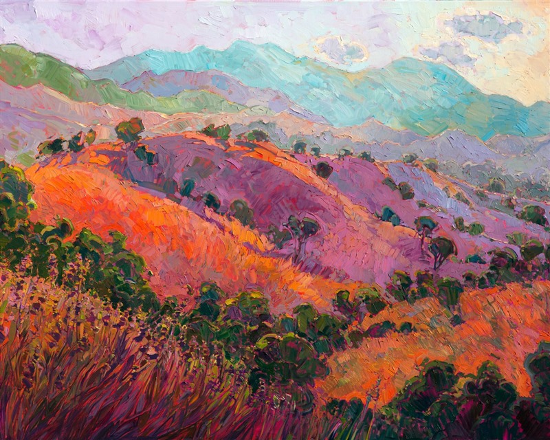 Style: "Open Impressionism" is a new style of painting developed by American artist Erin Hanson. The style is characterized by short, impasto brush strokes that are applied without layering, creating a mosaic or stained-glass appearance to the paintings. The paintings are created with a limited palette of colors, applied without blending or mixing upon the canvas, which adds a dimension of texture to each brush stroke. Inspired by classic impressionism, pointillism, and post-impressionism, Erin Hanson continues the tradition of impressionism into the modern day with her colorful and vivacious landscape paintings.