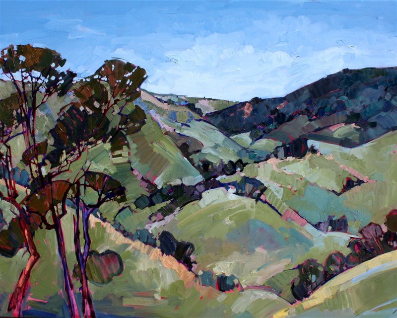 Style: "Open Impressionism" is a new style of painting developed by American artist Erin Hanson. The style is characterized by short, impasto brush strokes that are applied without layering, creating a mosaic or stained-glass appearance to the paintings. The paintings are created with a limited palette of colors, applied without blending or mixing upon the canvas, which adds a dimension of texture to each brush stroke. Inspired by classic impressionism, pointillism, and post-impressionism, Erin Hanson continues the tradition of impressionism into the modern day with her colorful and vivacious landscape paintings.