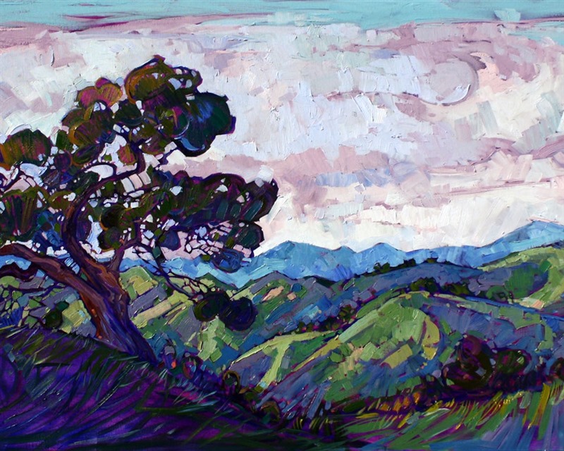 Style: "Open Impressionism" is a new style of painting developed by American artist Erin Hanson. The style is characterized by short, impasto brush strokes that are applied without layering, creating a mosaic or stained-glass appearance to the paintings. The paintings are created with a limited palette of colors, applied without blending or mixing upon the canvas, which adds a dimension of texture to each brush stroke. Inspired by classic impressionism, pointillism, and post-impressionism, Erin Hanson continues the tradition of impressionism into the modern day with her colorful and vivacious landscape paintings.