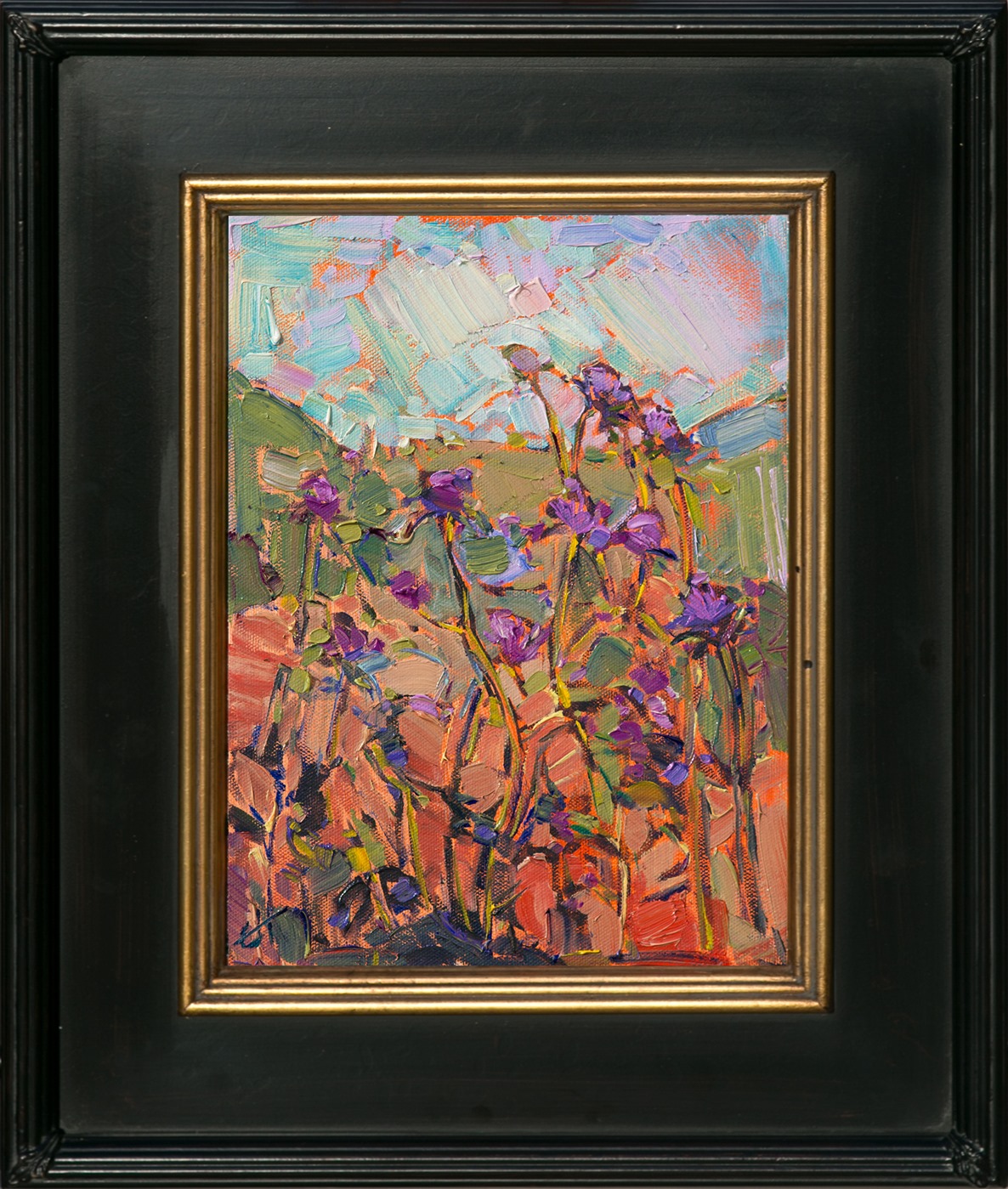 This elegant floater frame is specially chosen by Erin Hanson to set off her original works and 3D Textured Replicas. Erin paints her paintings with deliberate texture all the way to the edges of her canvas, so a floater frame allows you to enjoy the full picture. The frame's top face is finished in gold leaf, and the sides are black. The molding is 1/2" wide.