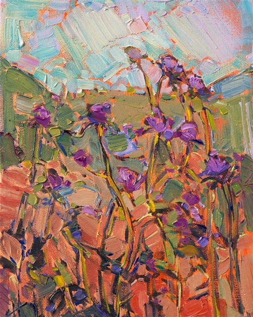 This is a petite oil painting, a loosely abstract vision of roadside thistles growing in Paso Robles, California. This painting utilizes soft greens and yellows of the distant hills to make the bright purple thistles in the foreground pop.