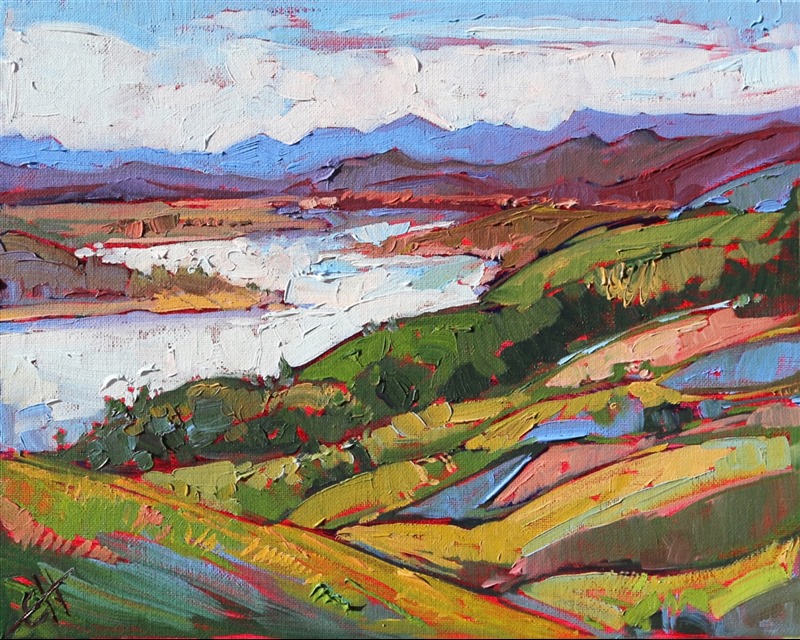 This painting captures Lake Naciamento, near Paso Robles, with loose brush strokes and vivid color.