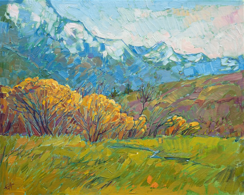 Note on varnishing: Erin’s paintings take six to eight weeks to dry, at which time we apply a retouching varnish, which allows the painting to complete the curing process while having a layer of protection against dirt and scuffs. The full curing process for an impasto oil painting takes at least two years. We are happy to assist in applying a final finishing varnish to your Erin Hanson oil painting once it has been dry for at least two years. Here is more information on how to care for your original oil painting.