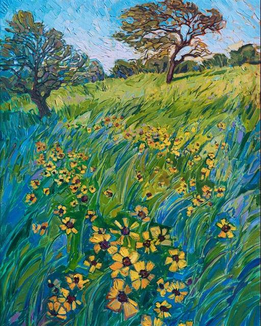 Erin devoted three years to perfecting the technology of 3D art printing in a quest to create a fine art print that captured her vibrant colors and reproduced the texture crucial to her artistic vision. The rhythms of texture in her luscious, impasto oil paintings communicate the movement and joy she finds in nature.