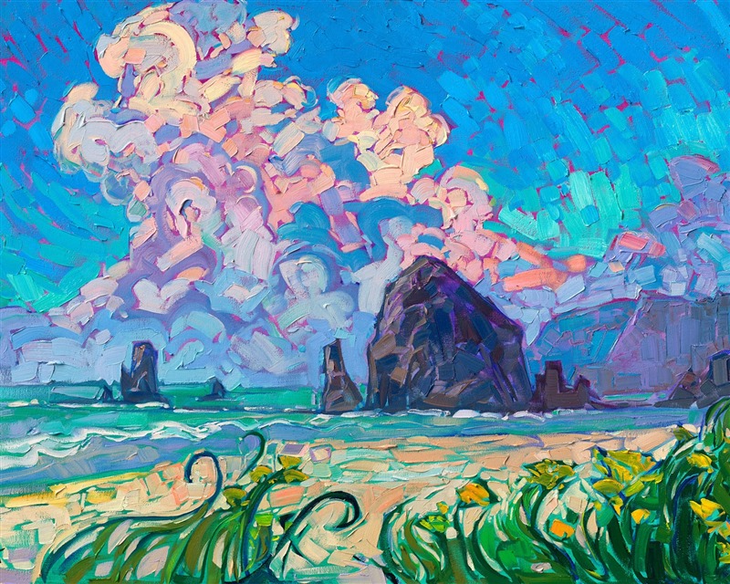 "Cannon Beach" is an original oil painting by Erin Hanson, created in her signature Open Impressionism style. The painting arrives framed in a contemporary gold floater frame, ready to hang.