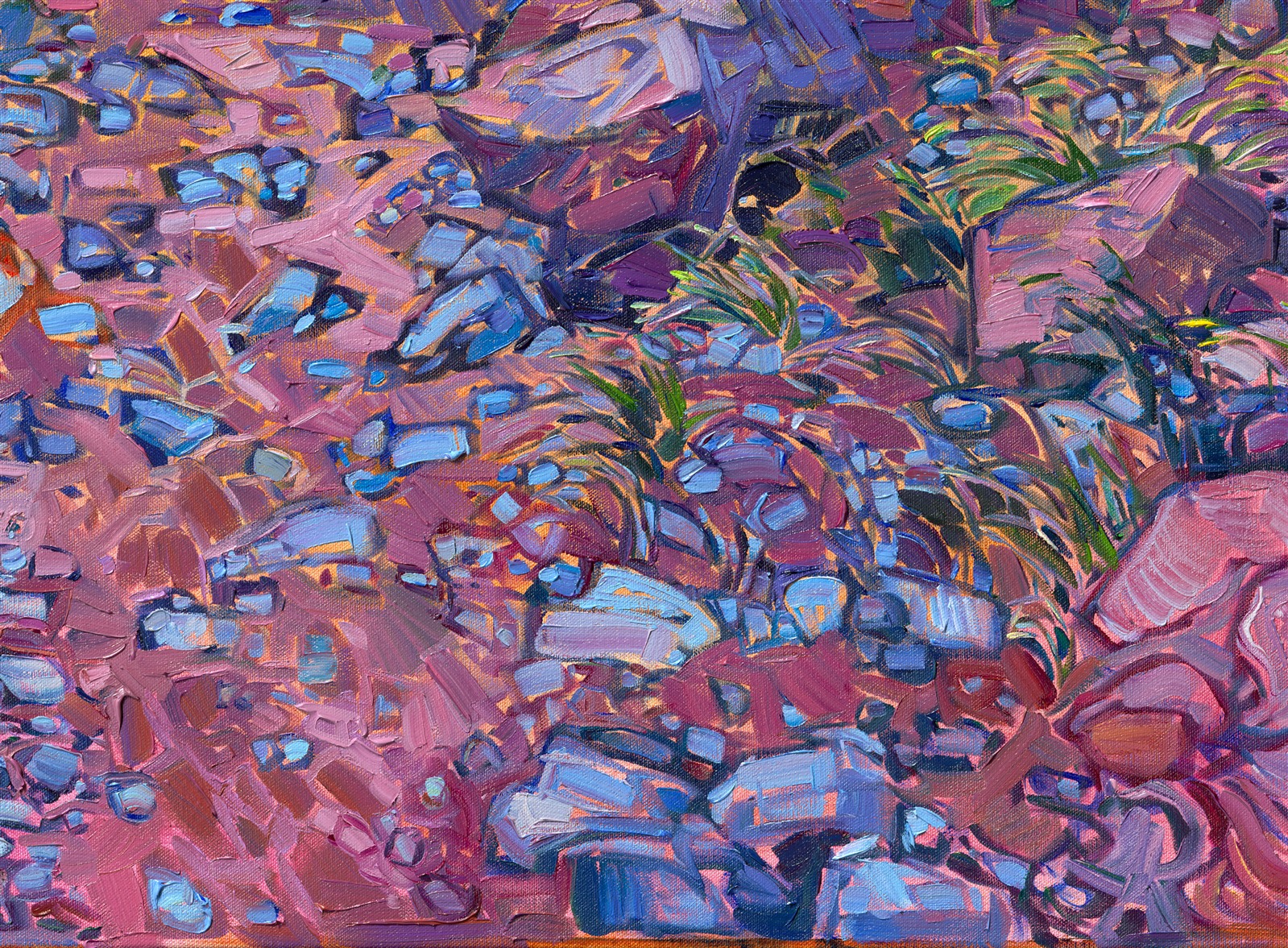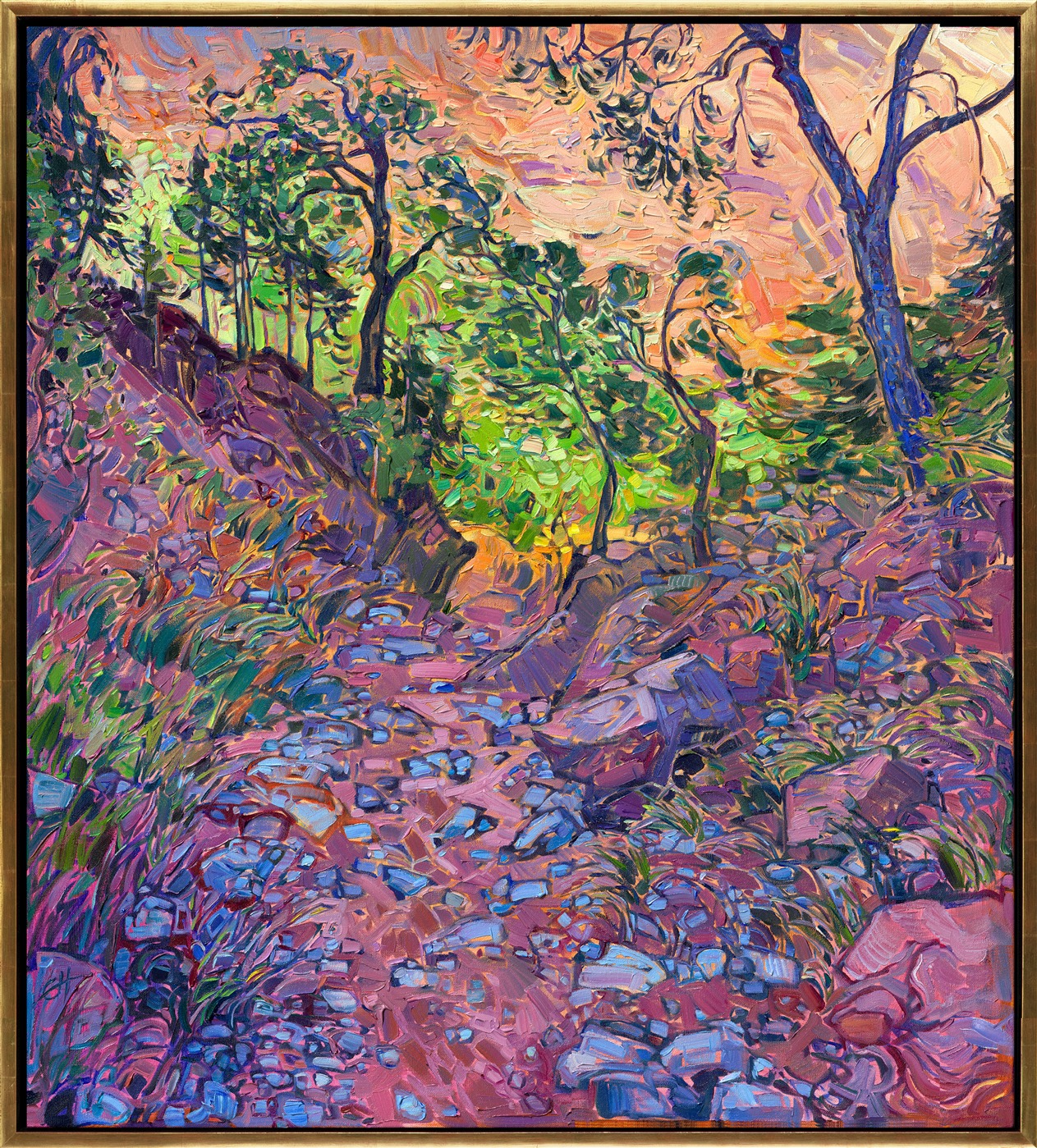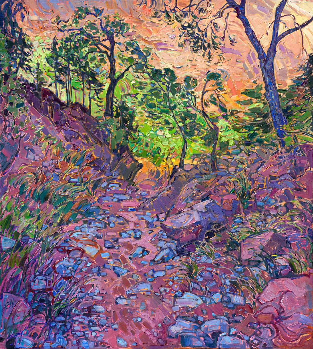 Style: "Open Impressionism" is a new style of painting developed by American artist Erin Hanson. The style is characterized by short, impasto brush strokes that are applied without layering, creating a mosaic or stained-glass appearance to the paintings. The paintings are created with a limited palette of colors, applied without blending or mixing upon the canvas, which adds a dimension of texture to each brush stroke. Inspired by classic impressionism, pointillism, and post-impressionism, Erin Hanson continues the tradition of impressionism into the modern day with her colorful and vivacious landscape paintings.