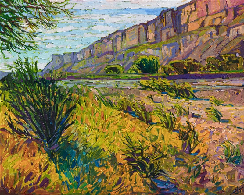 Big Bend National Park is most beautiful in the spring, when the reddish landscape becomes tinged with apple greens and golden yellows. This painting captures this scintillating color with loose, expressive brush strokes and thickly applied paint.