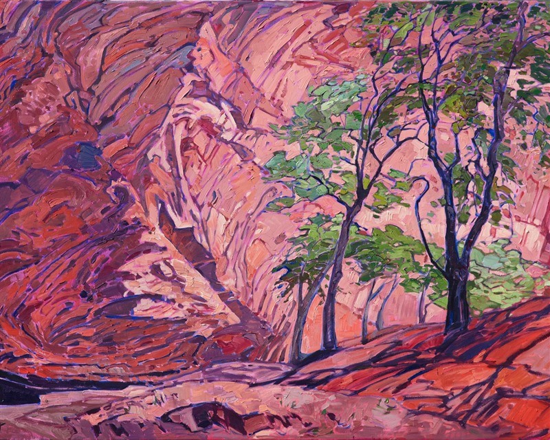 ERIN HANSON has been painting in oils since she was 8 years old. As a teenager, she apprenticed at a mural studio where she worked on 40-foot-long paintings while selling art commissions on the side. After being told it was too hard to make a living as an artist, she got her degree in Bioengineering from UC Berkeley. Afterward, Erin became a rock climber at Red Rock Canyon, Nevada. Inspired by the colorful scenery she was climbing, she decided to return to her love of painting and create one new painting every week.