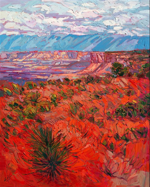 Afternoon light filters through low clouds hanging over Canyonlands National Park, in Utah. This stunning red rock vista is almost too beautiful to comprehend in person, and this painting captures that transient light and incredible beauty of the moment.