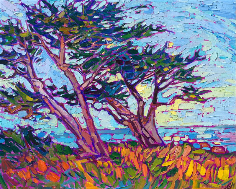 Carmel-by-the-Sea is captured in vivid, saturated hues, and impasto brush strokes. This petite oil painting captures all the wide vista of the sea on a small canvas.