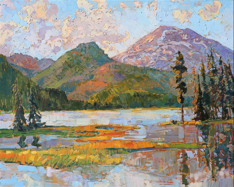 Style: "Open Impressionism" is a new style of painting developed by American artist Erin Hanson. The style is characterized by short, impasto brush strokes that are applied without layering, creating a mosaic or stained-glass appearance to the paintings. The paintings are created with a limited palette of colors, applied without blending or mixing upon the canvas, which adds a dimension of texture to each brush stroke. Inspired by classic impressionism, pointillism, and post-impressionism, Erin Hanson continues the tradition of impressionism into the modern day with her colorful and vivacious landscape paintings.