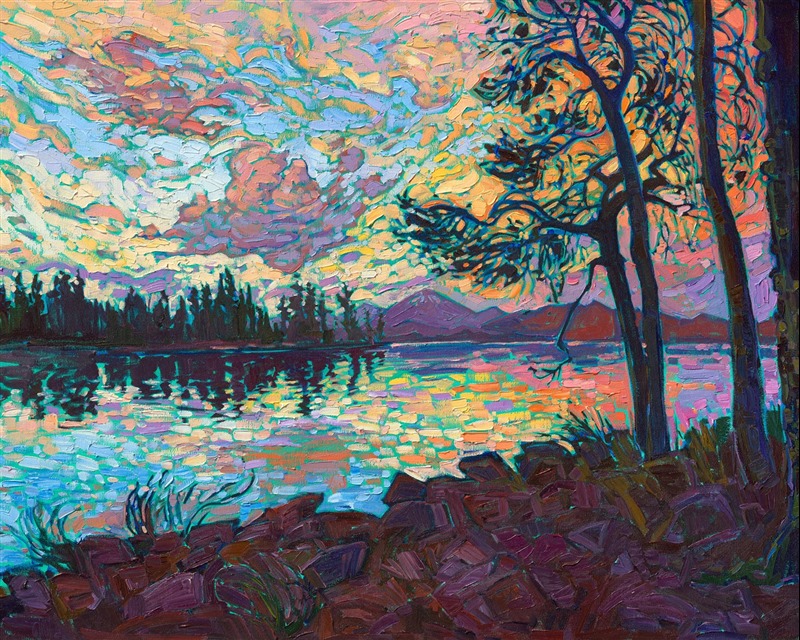 Style: "Open Impressionism" is a new style of painting developed by American artist Erin Hanson. The style is characterized by short, impasto brush strokes that are applied without layering, creating a mosaic or stained-glass appearance to the paintings. The paintings are created with a limited palette of colors, applied without blending or mixing upon the canvas, which adds a dimension of texture to each brush stroke. Inspired by classic impressionism, pointillism, and post-impressionism, Erin Hanson continues the tradition of impressionism into the modern day with her colorful and vivacious landscape paintings.
