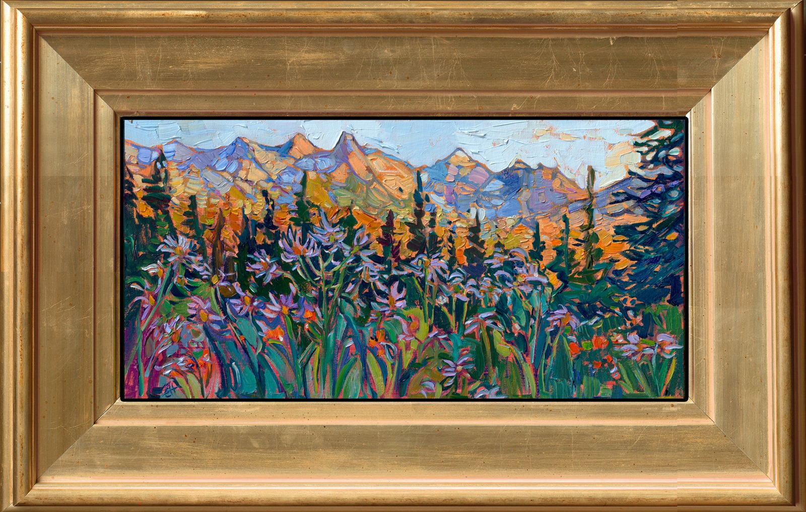 This distressed gold molding is custom-made for Erin Hanson. The classic lines are perfect for setting off the colors of a Hanson painting. The molding is 4” wide.