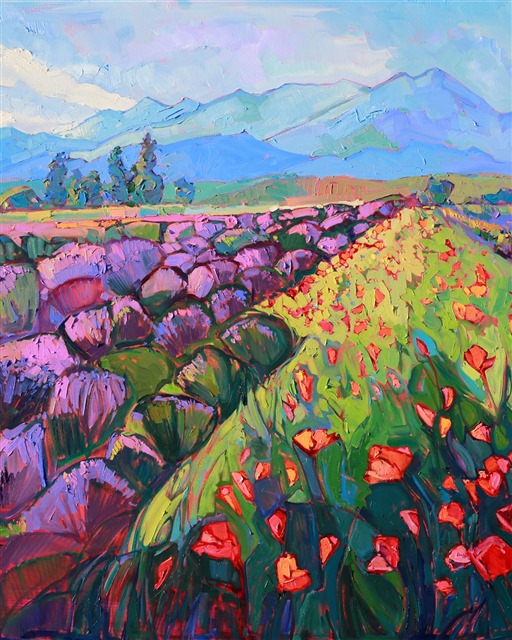 Erin has always wanted to paint lavender fields, but she had never seen cultivated farms until she visited Sequim, near Seattle, Washington. The brilliant purples contrasted against red and orange poppies, with the pale blue mountains towering in the distance, was one of the most idyllic landscapes she had ever seen!