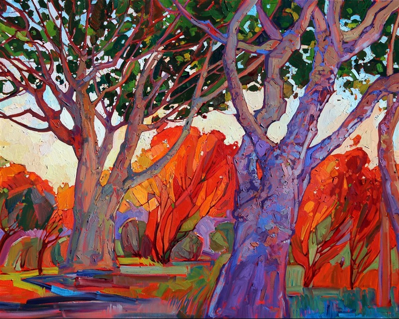 Huge cathedral-like trees tower overhead in Pasadena, the autumn trees capturing the light through the splayed branches. The heavy texture of the paint interplays with the compositional shapes of the work, drawing you deeper into the forest light.