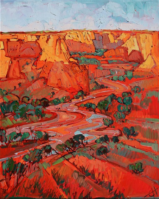 Canyon de Chelly has amazing sunrises, the cadmium sun rays slowly rising over the edge of the canyon, casting long shadows across the lush green canyon floor. The brush strokes in this painting are alive with texture and motion, vibrant with colors that stir the senses.