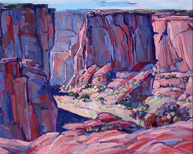Pink sandstone cliffs cast long blue shadows at Canyon de Chelly Monument, Arizona. This painting brings to life the color and drama of this beautiful Monument.