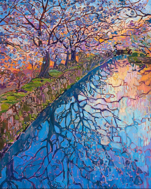I visited Kyoto, Japan, this year to photograph the Sakura season--Japanese cherry trees in bloom. This painting captures the view from Philosopher's Path, a winding walkway of large stones that traverses the width of Kyoto. The path follows a water-filled canal, and cherry trees overhang the entire walkway. This painting captures the peaceful beauty of cherry trees at dusk.
