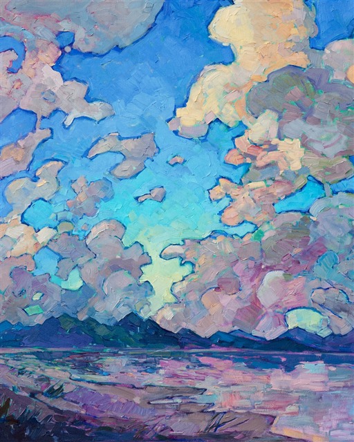 Note on varnishing: Erin’s paintings take six to eight weeks to dry, at which time we apply a retouching varnish, which allows the painting to complete the curing process while having a layer of protection against dirt and scuffs. The full curing process for an impasto oil painting takes at least two years. We are happy to assist in applying a final finishing varnish to your Erin Hanson oil painting once it has been dry for at least two years. Here is more information on how to care for your original oil painting.