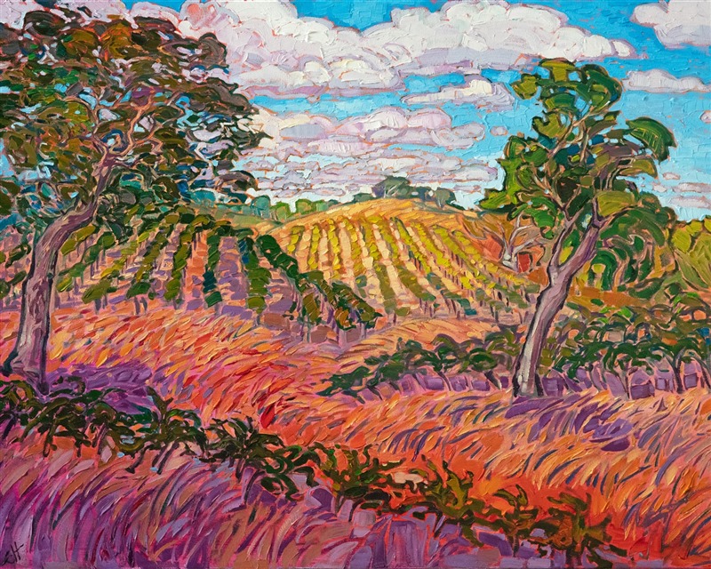 Note on varnishing: Erin’s paintings take six to eight weeks to dry, at which time we apply a retouching varnish, which allows the painting to complete the curing process while having a layer of protection against dirt and scuffs. The full curing process for an impasto oil painting takes at least two years. We are happy to assist in applying a final finishing varnish to your Erin Hanson oil painting once it has been dry for at least two years. Here is more information on how to care for your original oil painting.