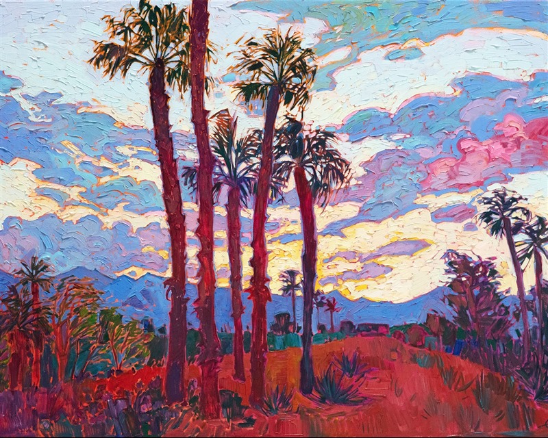 Note on varnishing: Erin’s paintings take six to eight weeks to dry, at which time we apply a retouching varnish, which allows the painting to complete the curing process while having a layer of protection against dirt and scuffs. The full curing process for an impasto oil painting takes at least two years. We are happy to assist in applying a final finishing varnish to your Erin Hanson oil painting once it has been dry for at least two years. Here is more information on how to care for your original oil painting.