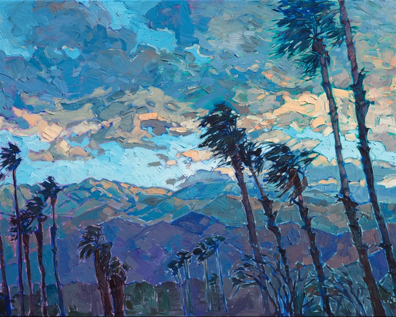 Wind-swept clouds roll over the Santa Rosa Mountains in this La Quinta-inspired painting. You can almost hear the wind rushing through the fronds of the desert palms and feel the storm clouds in the air. The brush strokes are loose and impressionistic, conveying a sense of motion and spontaneity.