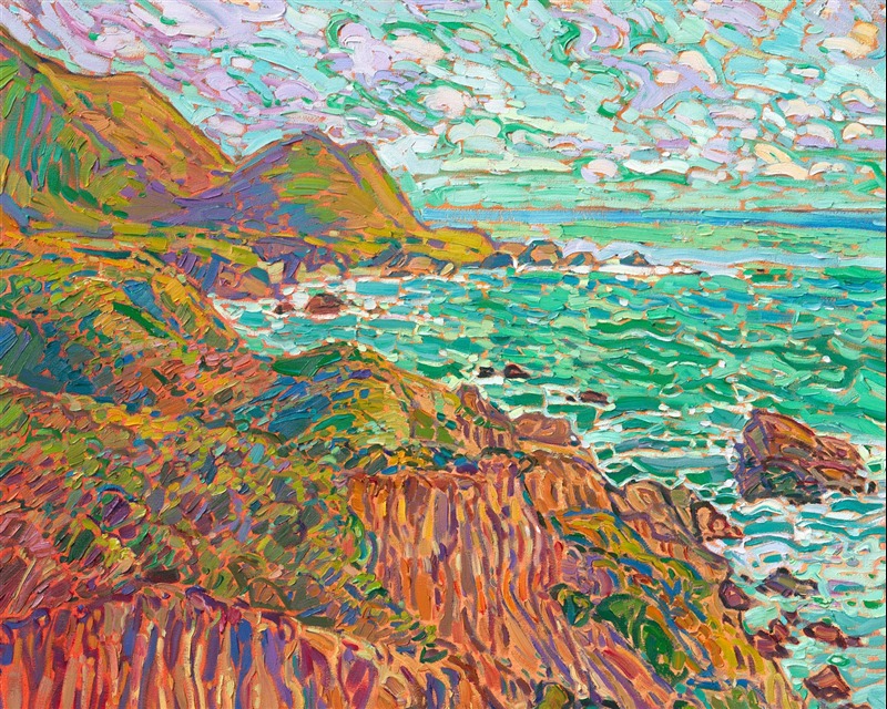 "Coastal in Green" is an original oil painting on stretched canvas, framed in a gold floating frame. The piece will be displayed at Erin Hanson's solo museum show Erin Hanson: Alchemist of Color at the Channel Islands Maritime Museum in Oxnard, California. You may purchase this painting now, but the piece will not be delivered until after the show ends on December 28th, 2023.