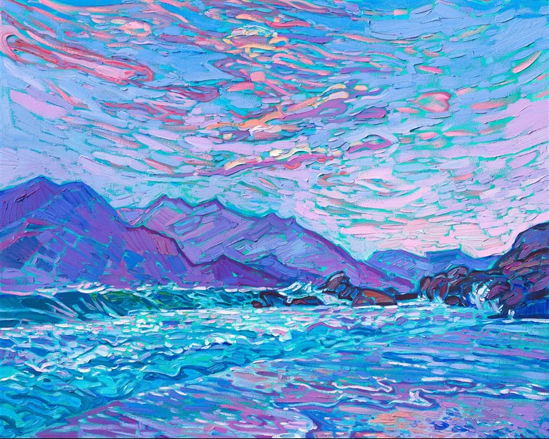 "Coastal in Purple" is an original oil painting on stretched canvas, framed in a gold floating frame. The piece will be displayed at Erin Hanson's solo museum show Erin Hanson: Alchemist of Color at the Channel Islands Maritime Museum in Oxnard, California. You may purchase this painting now, but the piece will not be delivered until after the show ends on December 28th, 2023.