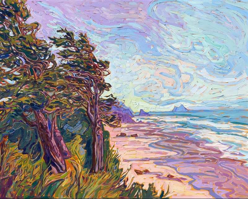 "Coastal Pines" was created on gallery-depth canvas, with the painting continued around the edges of the canvas. The painting arrives framed in a simple gold floater frame finished in burnished 23kt gold leaf.