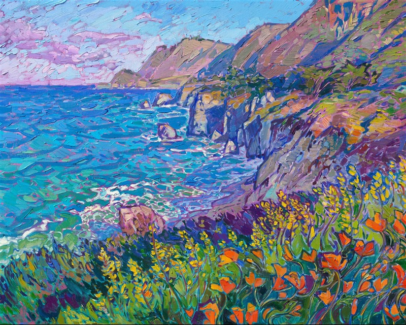 Highway 1 has been an endless source of inspiration for me as a painter. I first started painting the crystal turquoise waters of the Pacific Ocean about twelve years ago when I started exploring Paso Robles and the coastal region between Hearst Castle and Big Sur. I love painting swirling waves of white sea foam against aquamarine water. When orange poppies bloom along Highway 1, there is even more color to inspire me.