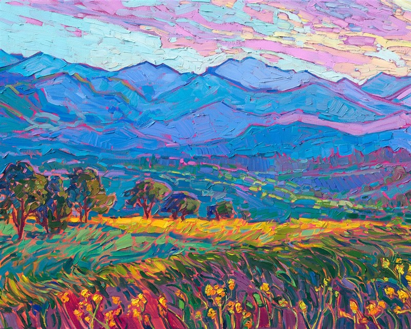 Style: "Open Impressionism" is a new style of painting developed by American artist Erin Hanson. The style is characterized by short, impasto brush strokes that are applied without layering, creating a mosaic or stained-glass appearance to the paintings. The paintings are created with a limited palette of colors, applied without blending or mixing upon the canvas, which adds a dimension of texture to each brush stroke. Inspired by classic impressionism, pointillism, and post-impressionism, Erin Hanson continues the tradition of impressionism into the modern day with her colorful and vivacious landscape paintings.