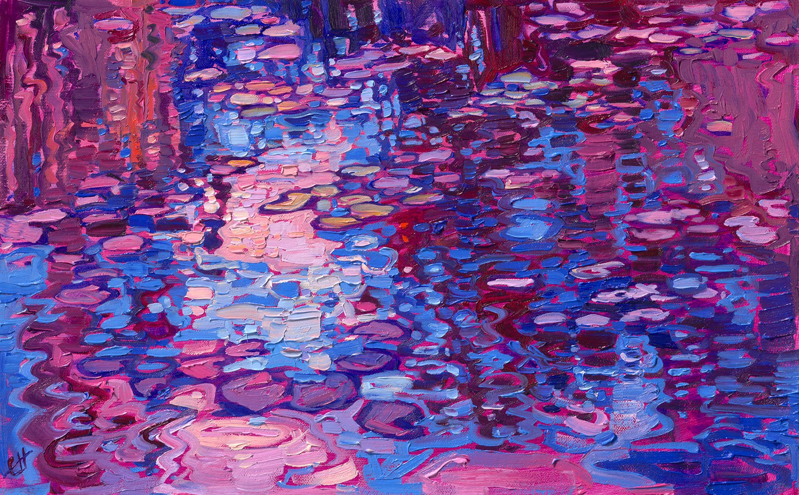 Note on varnishing: Erin’s paintings take six to eight weeks to dry, at which time we apply a retouching varnish, which allows the painting to complete the curing process while having a layer of protection against dirt and scuffs. The full curing process for an impasto oil painting takes at least two years. We are happy to assist in applying a final finishing varnish to your Erin Hanson oil painting once it has been dry for at least two years. Here is more information on how to care for your original oil painting.