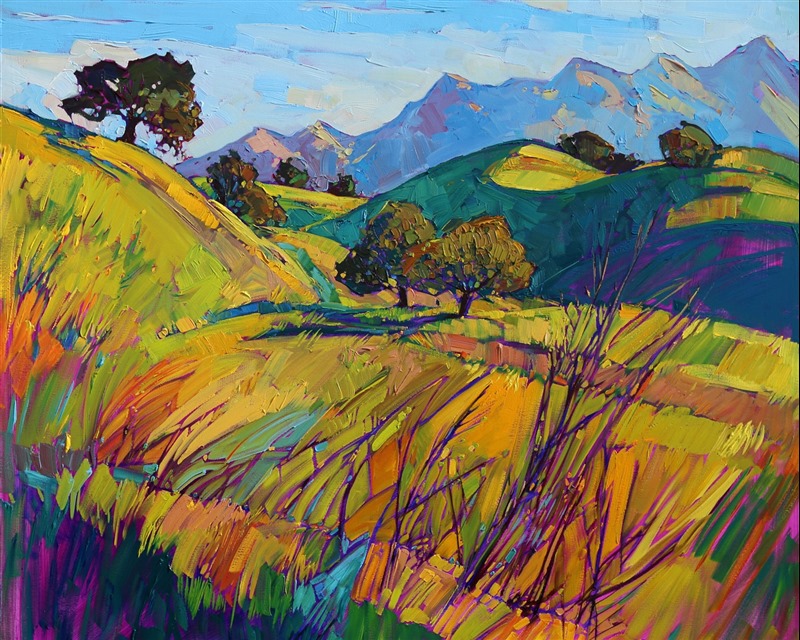 Style: "Open Impressionism" is a new style of painting developed by American artist Erin Hanson. The style is characterized by short, impasto brush strokes that are applied without layering, creating a mosaic or stained-glass appearance to the paintings. The paintings are created with a limited palette of colors, applied without blending or mixing upon the canvas, which adds a dimension of texture to each brush stroke. Inspired by classic impressionism, pointillism, and post-impressionism, Erin Hanson continues the tradition of impressionism into the modern day with her colorful and vivacious landscape paintings.