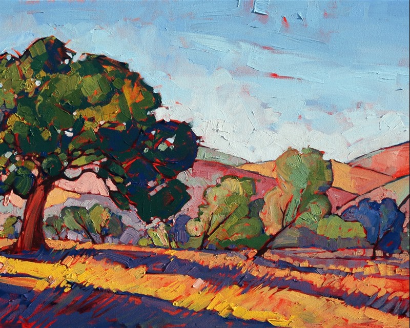 Erin Hanson has spent many years soaking up the colors and seasonal changes of Paso Robles. This colorful painting is how the artist sees central California in the late summer, capturing a mood of hope and sunlight. The brush strokes in this painting are thick and expressive, creating a beautiful mosaic of color and texture.