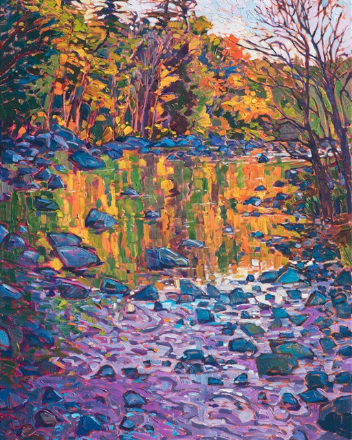 The still waters of a stream catch the autumn reflections like a mirror, glimmering with hues of copper and green. A lavender sky above gives a hint of the winter to come, and this painting captures the magical moment of color before the frost.