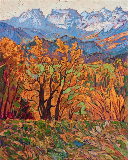 Note on varnishing: Erin’s paintings take six to eight weeks to dry, at which time we apply a retouching varnish, which allows the painting to complete the curing process while having a layer of protection against dirt and scuffs. The full curing process for an impasto oil painting takes at least two years. We are happy to assist in applying a final finishing varnish to your Erin Hanson oil painting once it has been dry for at least two years. Here is more information on how to care for your original oil painting.