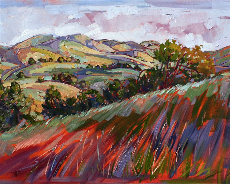 Rolling rainbow hills of central California, painted in a loose impressionist style.