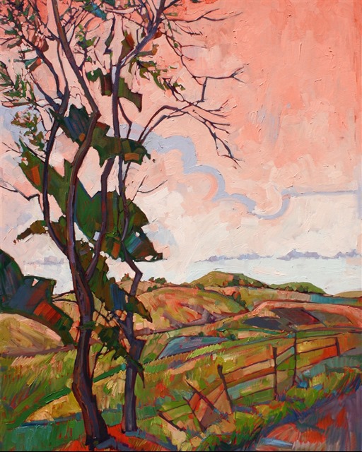 This whimsical painting communicates the beautiful pink and salmon colors that dance across Paso Robles during a sunset.