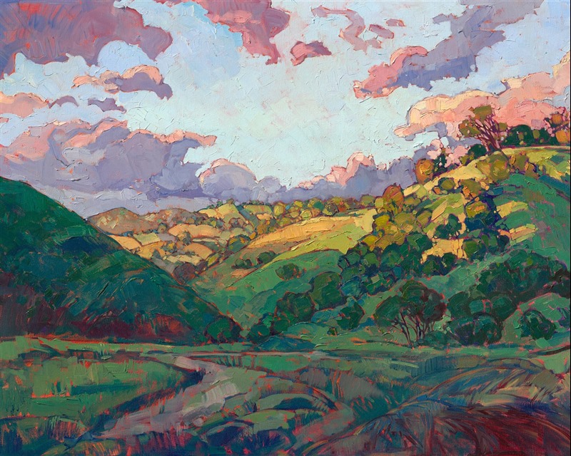Style: "Open Impressionism" is a new style of painting developed by American artist Erin Hanson. The style is characterized by short, impasto brush strokes that are applied without layering, creating a mosaic or stained-glass appearance to the paintings. The paintings are created with a limited palette of colors, applied without blending or mixing upon the canvas, which adds a dimension of texture to each brush stroke. Inspired by classic impressionism, pointillism, and post-impressionism, Erin Hanson continues the tradition of impressionism into the modern day with her colorful and vivacious landscape paintings.