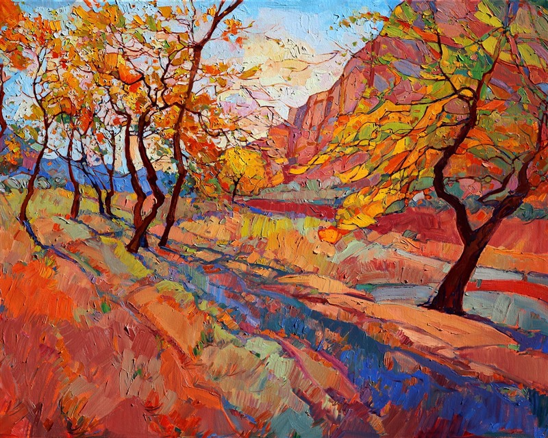 Style: "Open Impressionism" is a new style of painting developed by American artist Erin Hanson. The style is characterized by short, impasto brush strokes that are applied without layering, creating a mosaic or stained-glass appearance to the paintings. The paintings are created with a limited palette of colors, applied without blending or mixing upon the canvas, which adds a dimension of texture to each brush stroke. Inspired by classic impressionism, pointillism, and post-impressionism, Erin Hanson continues the tradition of impressionism into the modern day with her colorful and vivacious landscape paintings.
