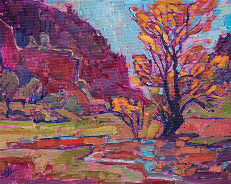 Style: "Open Impressionism" is a new style of painting developed by American artist Erin Hanson. The style is characterized by short, impasto brush strokes that are applied without layering, creating a mosaic or stained-glass appearance to the paintings. The paintings are created with a limited palette of colors, applied without blending or mixing upon the canvas, which adds a dimension of texture to each brush stroke. Inspired by classic impressionism, pointillism, and post-impressionism, Erin Hanson continues the tradition of impressionism into the modern day with her colorful and vivacious landscape paintings.