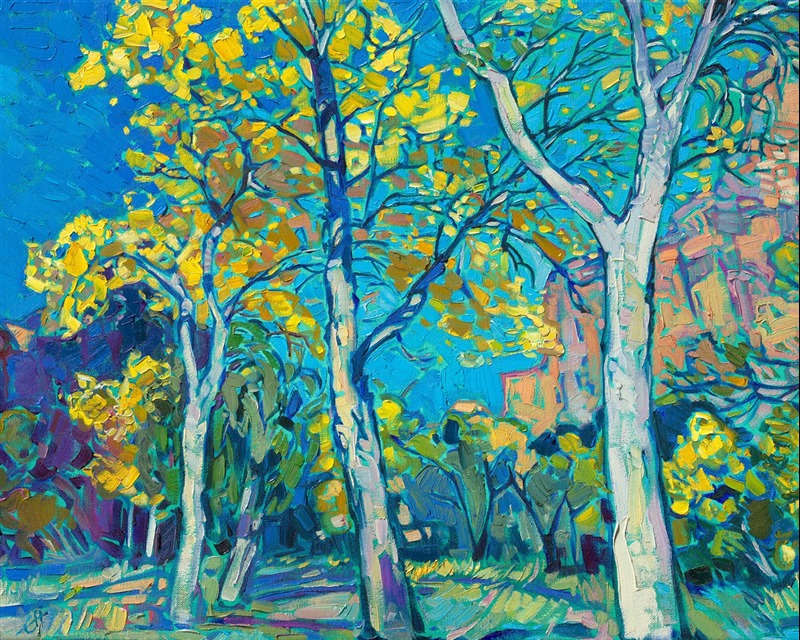 Note on varnishing: Erin’s paintings take six to eight weeks to dry, at which time we apply a retouching varnish, which allows the painting to complete the curing process while having a layer of protection against dirt and scuffs. The full curing process for an impasto oil painting takes at least two years. We are happy to assist in applying a final finishing varnish to your Erin Hanson oil painting once it has been dry for at least two years. Here is more information on how to care for your original oil painting.